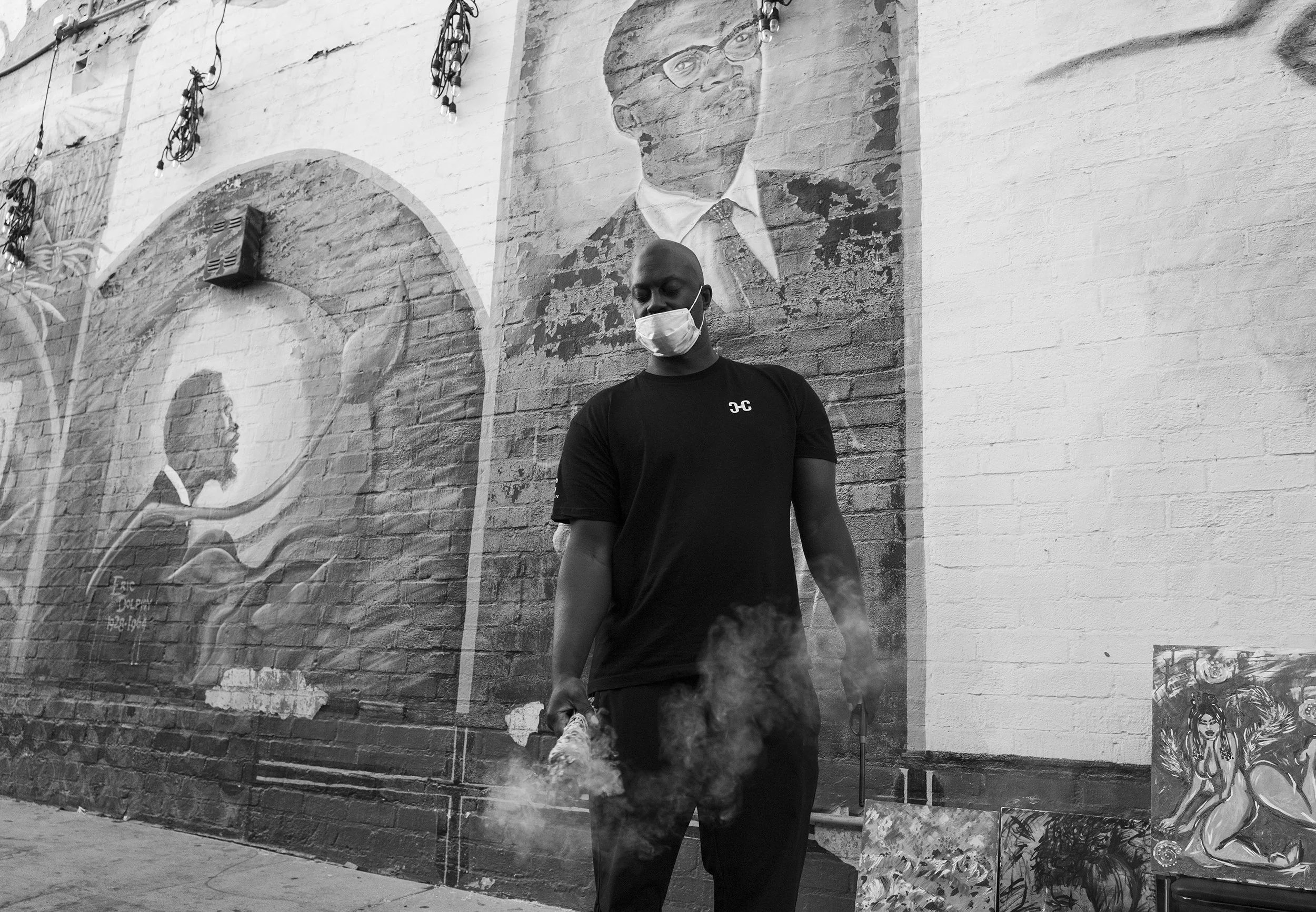 Brandon Williams, a multi-disciplinary artist, playing his trumpet in the Bunker Hill area of downtown Los Angeles.